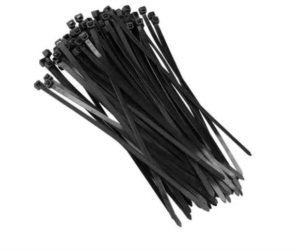 A embalagem contém 100 unidades de abraçadeiras plásticas em nylon, na cor preta, com 10 cm de comprimento e 2,5 mm de largura.