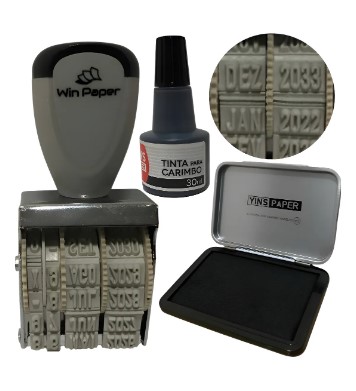 Inclui 1 carimbo datador com anos até 2033, 1 almofada preta de alta durabilidade e 1 frasco de tinta para carimbo de 30 ml.