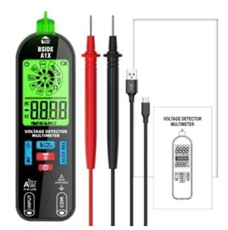 O multímetro BSIDE possui design compacto e display digital grande e iluminado, que facilita a leitura dos valores medidos. Ele vem acompanhado de dois cabos de teste e cabo USB para recarga. O funcionamento é simples, com botões para escolher modos de medição e botão de retenção dos dados. Oferece medidas para tensão AC e DC, teste de continuidade, e capacidade para medir capacitores. Um aparelho prático e versátil para várias necessidades de medição elétrica.